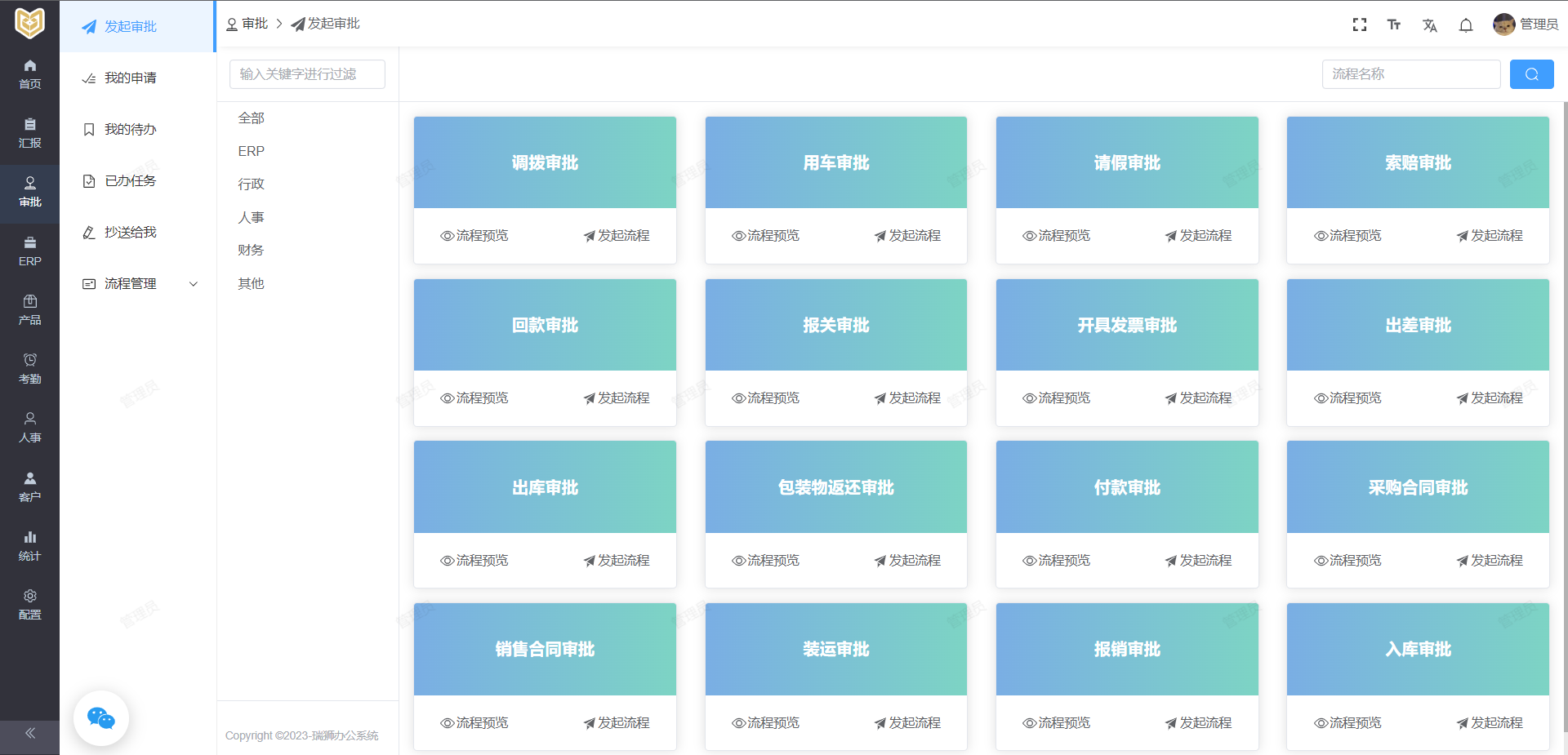 6、审批:调拨审批,请假审批,回款审批,派车审批,发票审批,出差审批,出库审批,付款审批等。
