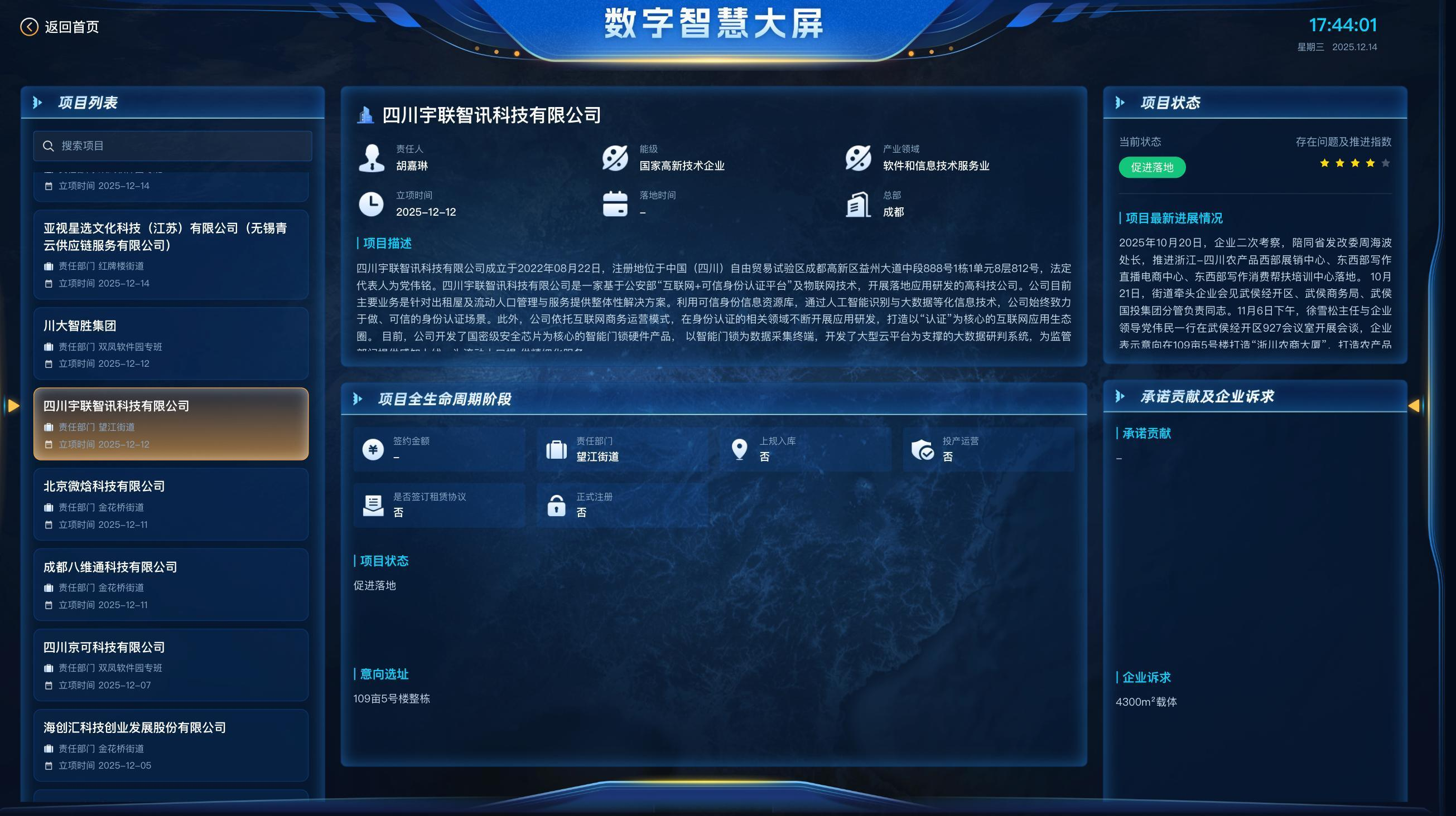 - 数字智慧大屏:实时呈现招商进度、产业分布、企业运营等核心数据,实现园区运营可视化
